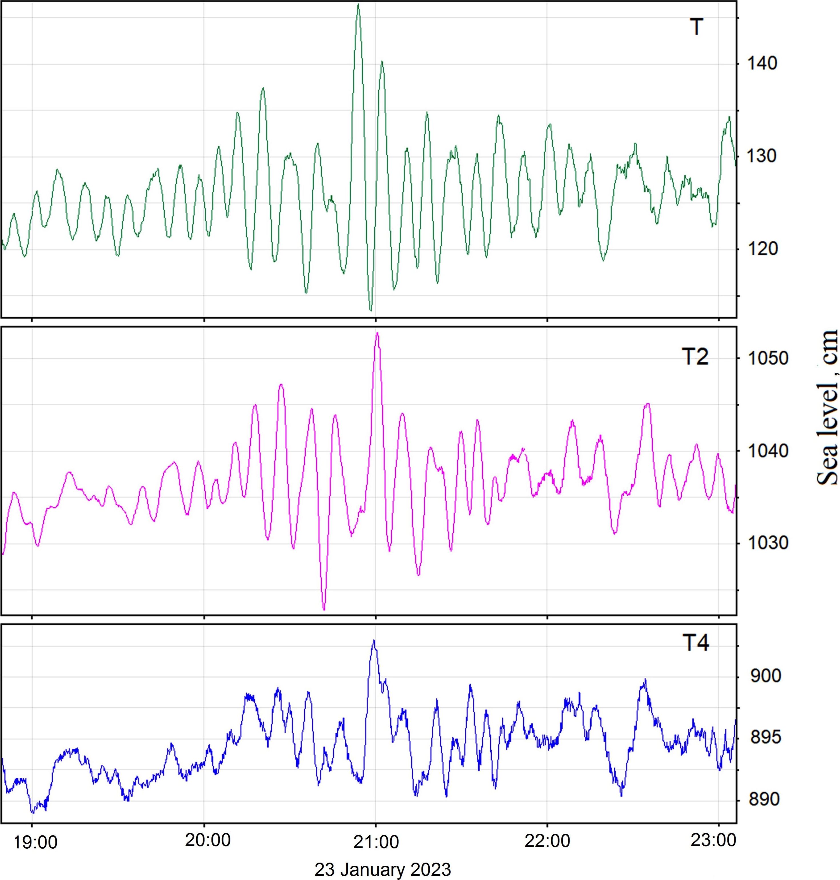 Time variation of sea level oscillations without taking into account the pre-calculated tide in two bays and in the open sea is represented in Fig. 5 for January 23, 2023. A significant increase in the amplitudes of sea level oscillations with close-by frequencies in the bays from 20:00 to 22:00 is clearly visible. For the open sea, the increase in oscillation amplitudes is 1.5–2 times smaller. At the same time, sea level oscillations at 21:00 in Kholmsk-Severny Bay (T2 meter) and in the open sea (T4 meter) almost coincide in phase, and in Trade Port Bay (T meter) are in an antiphase with them. Note that such synchronous increases in amplitudes are observed quite often and the cases when oscillations with maximum amplitudes in bays coincide in phase (for example, 11 March 2023) also take place.