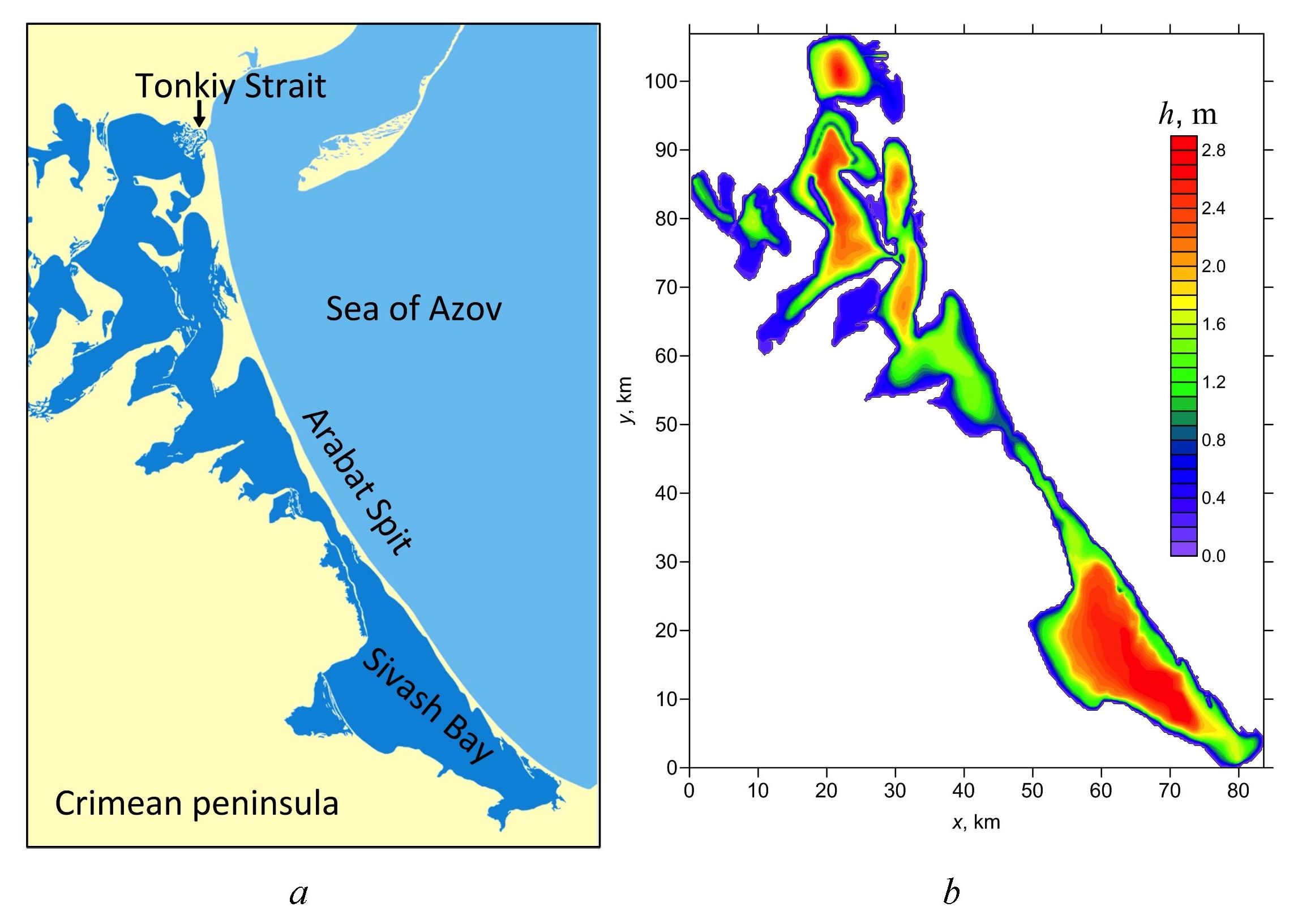 F i g. 1. Location of East Sivash Bay (a), model bottom relief of East Sivash Bay (b)