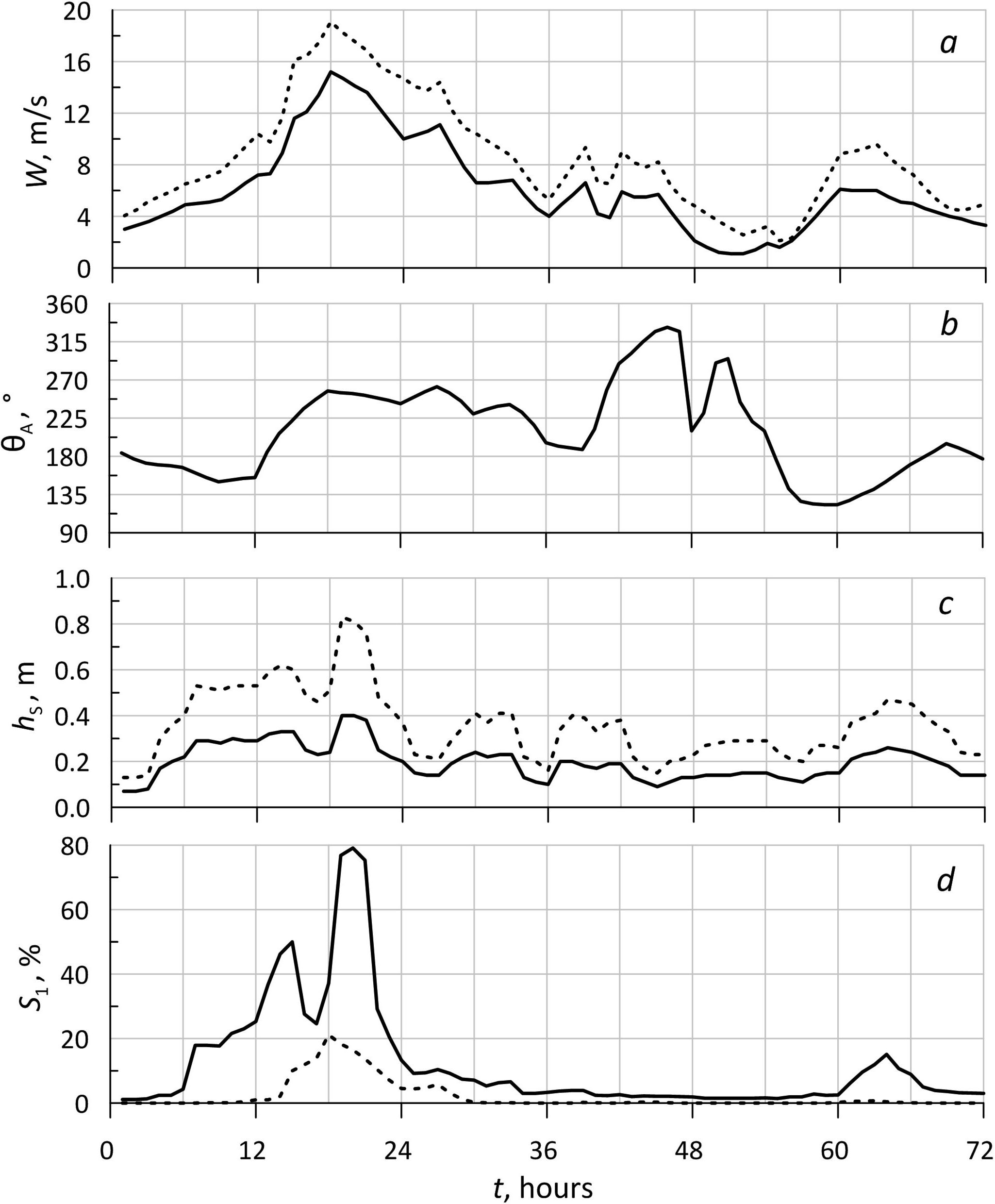 The most significant W variations occur in the time interval from 0 to 36 h. Until t = 18 h, wind speed monotonically increases from 4 m/s to its maximum value. At t ≤ 12 h, the prevailing wind is from the south and southeast. After 12 o'clock, wind changes its direction to southwestern. At t > 18 h, the storm fades and the wind speed decreases.