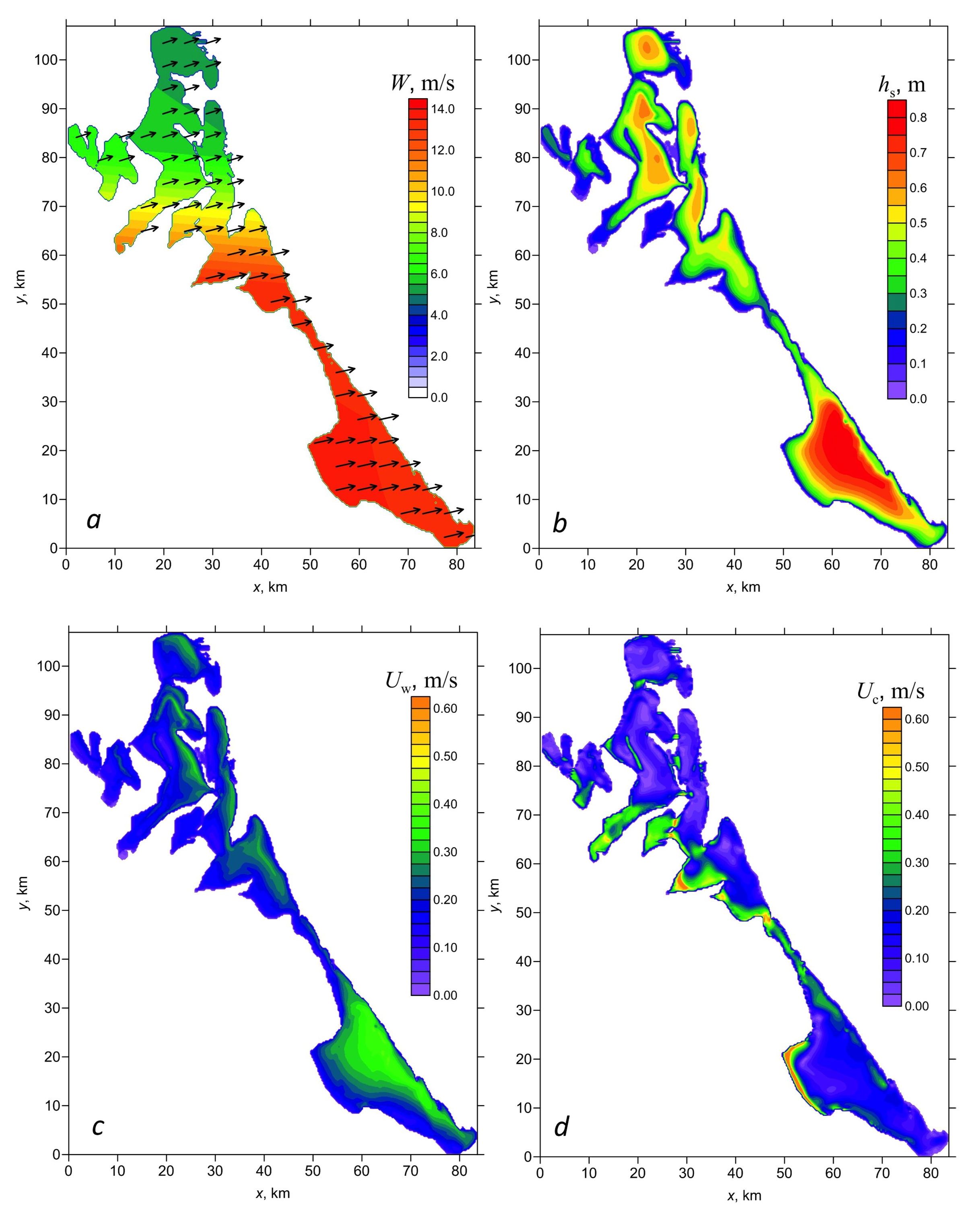 These fields correspond to the time moment t = 19 h, when the wind waves in the bay reached their maximum intensity. The wind has a predominant western-southwestern direction and its speed is maximum in the southern part of the bay (Fig. 3, a). Here, we can also see the area of maximum waves with wave heights exceeding 0.8 m (Fig. 3, b). Wave intensification occurs in the hollows. The areas of maximum waves are shifted to the windward coast. The velocity of bottom wave currents reaches 0.4 m/s. In this case, the configurations of the velocity field of near-bottom wave currents (Fig. 3, c) and the wave height field are well-corresponded to each other. The areas of maximum bottom wind currents with up to 0.8 m/s velocities are localized in shallow water near the leeward shores of the basin and in the narrowness connecting the northern and southern parts of the bay (Fig. 3, d).