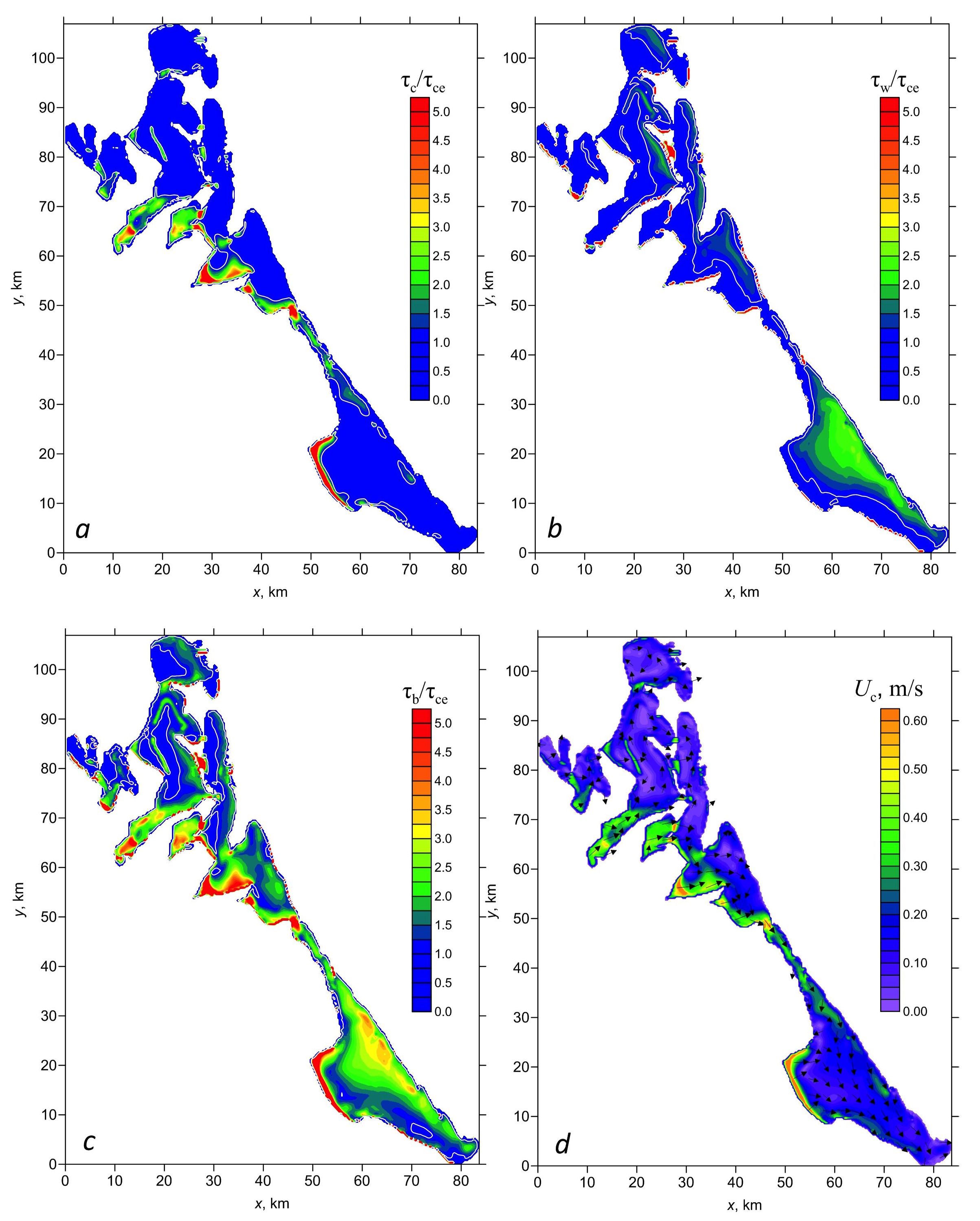 Figure 4 demonstrates the fields of bottom shear stresses , and for t = 19 h normalized to the critical value tce. In general, the configuration of these fields is similar to the one of the bottom current fields (Fig. 4, d). The component of shear stresses caused by wind currents increases near the leeward shores and the wave component of shear stresses, on the contrary, increases near the windward shores of the basin.