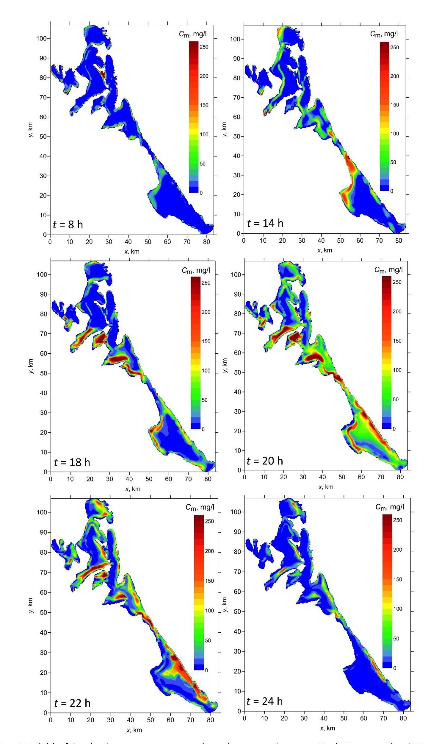 F i g. 5. Field of the depth-average concentration of suspended matter in Eastern Sivash Bay for different time points