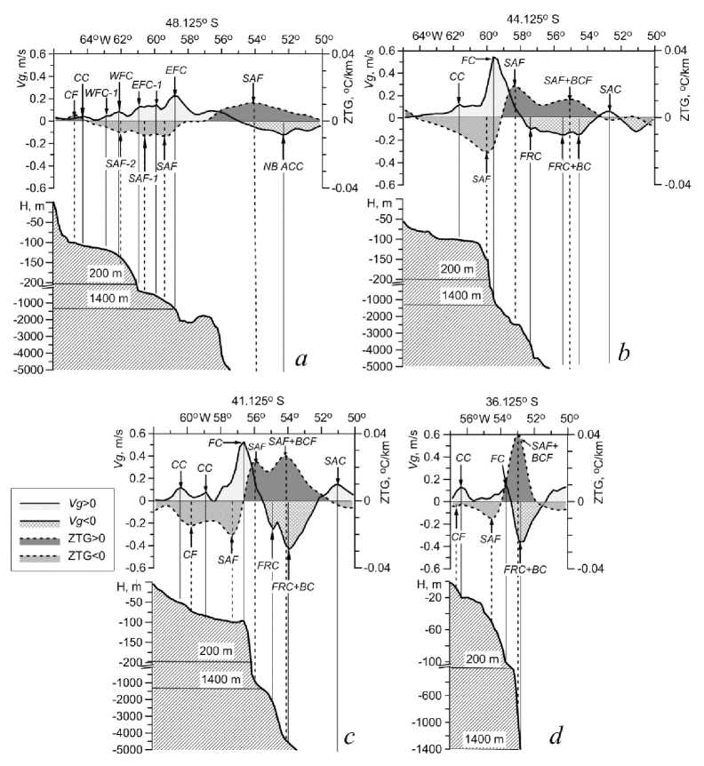 F i g. 2. Distributions of mean long-term values of ZTG (dashed curves) and Vg (solid curves) along 48.125°S (a), 44.125°S (b), 41.125°S (c) and 36.125°S (d) against the background of bottom profile (shaded). Positions of temperature fronts are shown by dashed lines, and those of current jets – by solid ones