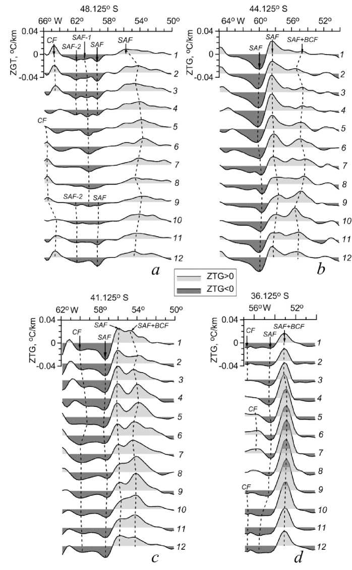 To the south of 48°S, above the northern boundary of the Falkland Plateau, the main extremum of the ZTG in the SAF structure observed throughout the year (Fig. 5, a) is maximally intensified in May (Figs. 6, a; 7, b) during the period of intense cooling of surface waters.