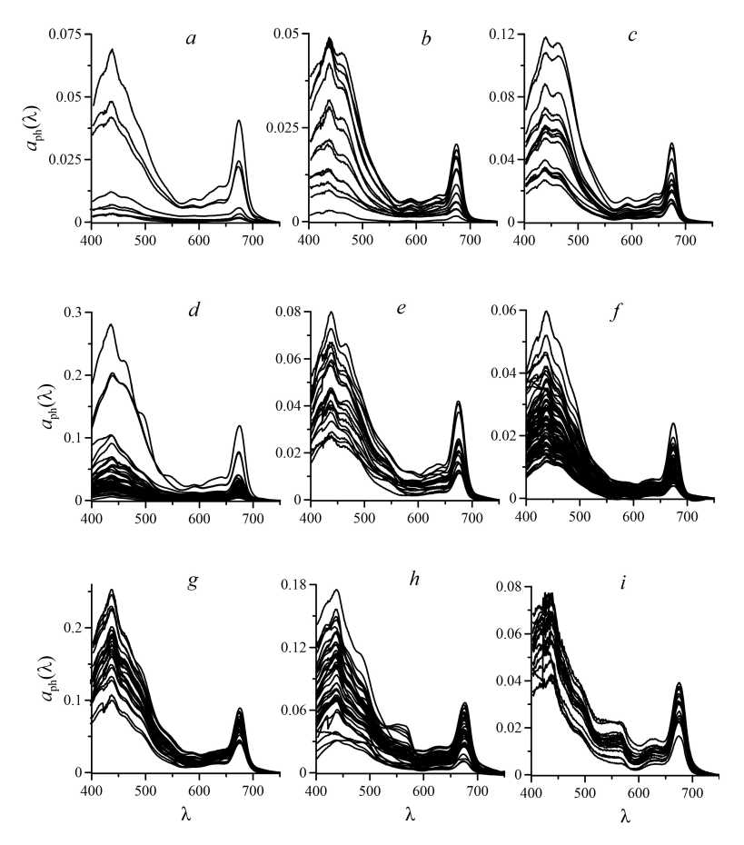 F i g. 2. Spectra of light absorption coefficients of phytoplankton (aph(λ)) in the surface layers of the Arctic Ocean (a), the Barents (b) and Norwegian (c) seas, Atlantic sector of the Southern Ocean (d), the Black Sea in winter (e) and summer (f), the Sea of Azov (g), and the Baikal (h) and Teletskoye (i) lakes