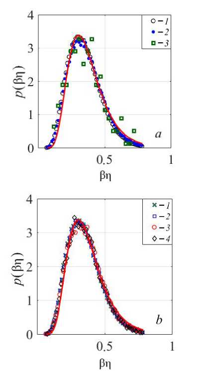 Let us determine the distributions of p(βη) at various observed whitecap speeds. The range of all measured (1–8 m/s) is divided into three intervals with a step m/s. In Fig. 2, a, symbols show the distributions of p(βη) in selected intervals of breaking rates (numbers in the legend). All probability densities p(βη) coincide practically and the entire set of points is satisfactorily described by function (1) shown by the red line.