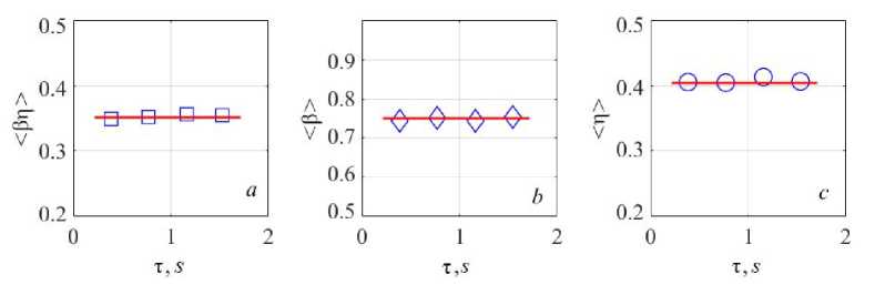 Average characteristics of distribution p(βη) are considered below. In Fig. 3, a, squares show the values of in the studied intervals, the solid line corresponds to the average value of equal to 0.35.