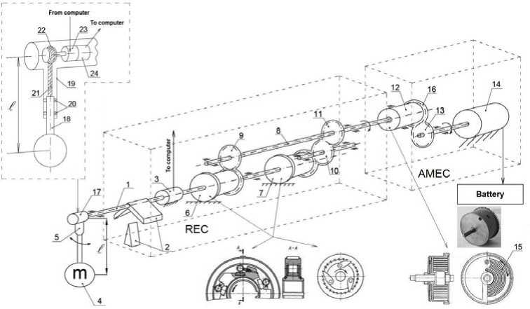 F i g. 5. Mechanism for converting roll energy into electric power: 1 – input shaft; 2 – twist stop; 3 – angle sensor; 4 – pendulum; 5 – extendable rod; 6 and 7 – unidirectional rotation freewheel couplings, e.g., ratchet or freewheel clutches, with tooth rims; 8 – output shaft; 9, 10 and 11 – gear wheels; 12 – spring drum; 13 – gear wheel of electric machine; 14 – electric machine; 15 – flat spiral spring; 16 – tooth rim; 17 – extendable rod mechanism; 18 – extendable rod; 19 – drive housing pipe; 20 – extendable rod bearings; 21 – rope; 22 – pulley; 23 – motor with gearbox; 24 – multi-turn angle sensor