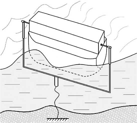 In the case of an anchored station with WPG, a structure shown in Fig. 6 can be used. In this structure, it is proposed to install two energy converters (Fig. 5), connect the extendable rods to each other with an additional horizontal rod and connect an anchor system in the center of the latter. In this case, the position of rod 5 (Fig. 5) will be controlled by the anchor and may be different from vertical; nevertheless, this will not affect the power generated by electric machine 14. Due to this structure, the station with WPG will be able to turn its side towards the direction of the waves.