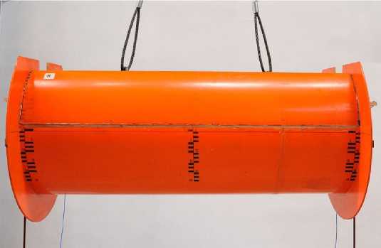 The cylindrical model was 1650 mm long, its hull diameter was 640 mm and the mass was 172 kg. The sides of the model were made high in order to keep the waterline area unchanged at large inclination angles. Two pendular systems (Fig. 8) were installed using ball bearings on both side plates of the model hull, at the level of the model center of gravity. The pendular systems comprised rods 1 with a length of 0.9 m fixed on rotation shafts 2 on the axis of the center of mass on the side faces of the model; the position of the axis of the center of mass was identified during the model preparation. The pendular systems were made in the form of rods; there was load 3 on each suspension which could be moved along the rod, thus changing the length of the pendulum. The loads were fixed on the rod using a screw stop.