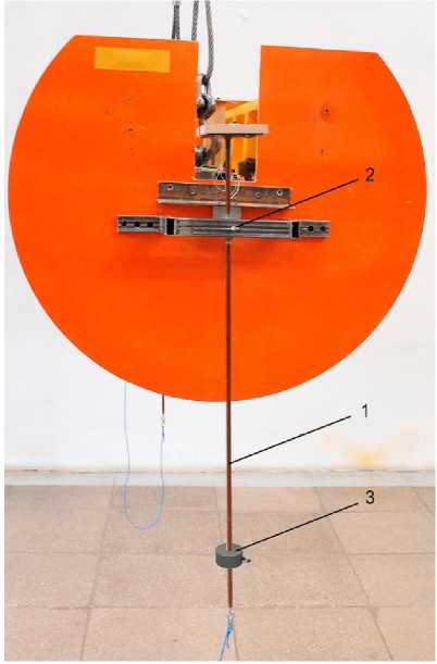 F i g. 8. One of two pendular systems fixed on the model sides: 1 – rod; 2 – rod rotation shaft fixed on the axis of the model center of mass; 3 – load with a screw stop moving along the rod