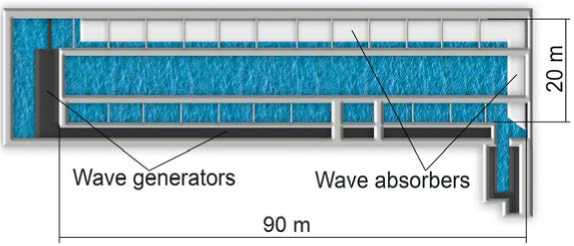 The model was tested in a wave basin (Fig. 9) 90 m long, 20 m wide and 4 m deep. The waves were formed by wave generator located at the end of the tank; it could generate regular (harmonic) waves with a length ranging from 0.6 to 12 m and a height from 20 to 240 mm or waves within a specified frequency band.
