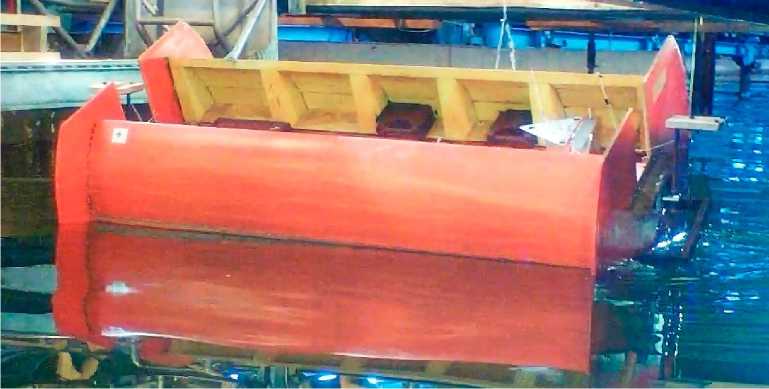 During the experiment, the model was positioned across the basin to model the position when the side faces the incident waves. The model heading was maintained by means of a retention system (Fig. 10) of two thin nylon ropes with elastic elements, one end of which was fixed to the model side at the height of its center of gravity and the other end — to basin structures. The rigidity of the elastic elements in the model retention system was to meet the requirement for the period of free sway oscillations of the retained model to differ enough from both the period of free roll oscillations and the average period of incident waves. This approach minimized the influence of the retention system on the model rolling.