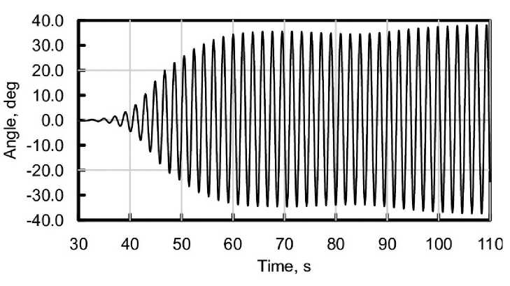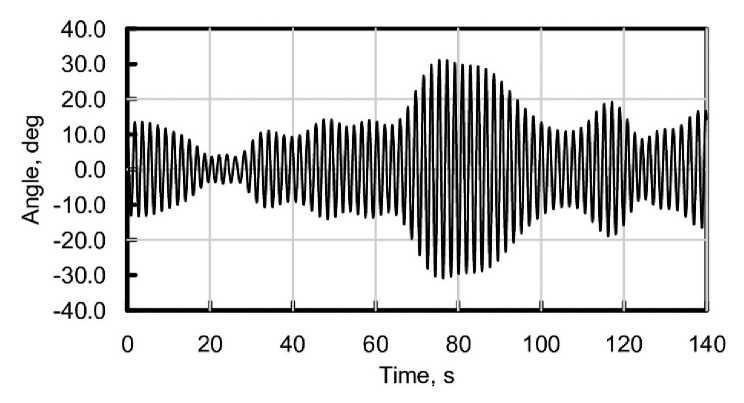 The record of the model roll in Fig. 12 shows the growing resonance effect which consists in increasing amplitude of oscillations when the wave frequencies coincide with the frequency of the model free oscillations. In this case, the model had performed about 15 oscillations before the amplitude became more than 30°. The maximum amplitude of the model steady-state oscillations was 38° while the wave slope angle was just 1.9° which is 20 times less. Obviously, when the wave height changes, its period remains the same, i.e., when the wave steepness changes, the maximum amplitude of rolling and the time of achieving significant amplitudes of oscillations will change as well. The greater wave steepness is, the larger rolling amplitude is and the faster significant amplitudes are achieved. This is due to the fact that energy of wave ЕW depends on its amplitude 20:
