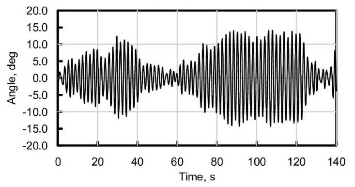 F i g. 13. Fragment of recorded realization of the model rolling in real time on irregular waves generated in the wave basin with spectrum No. 1 (τp = 1.89 s, hs = 87.71 mm)