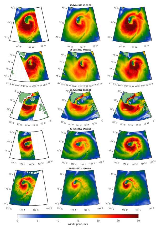 F i g. 1. Surface wind speed fields in considered ETCs. Left column: wind speeds estimated by the AMSR-2; middle column: the ERA5 wind speed estimations; right column: wind speeds adjusted using Eq. (4)