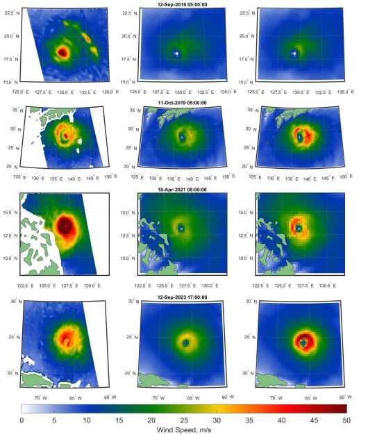 F i g. 3. Surface wind speed fields in considered TCs. Left column: wind speeds estimated by the AMSR-2; middle column: the ERA5 wind speed estimations; right column: wind speeds adjusted using Eq. (4)