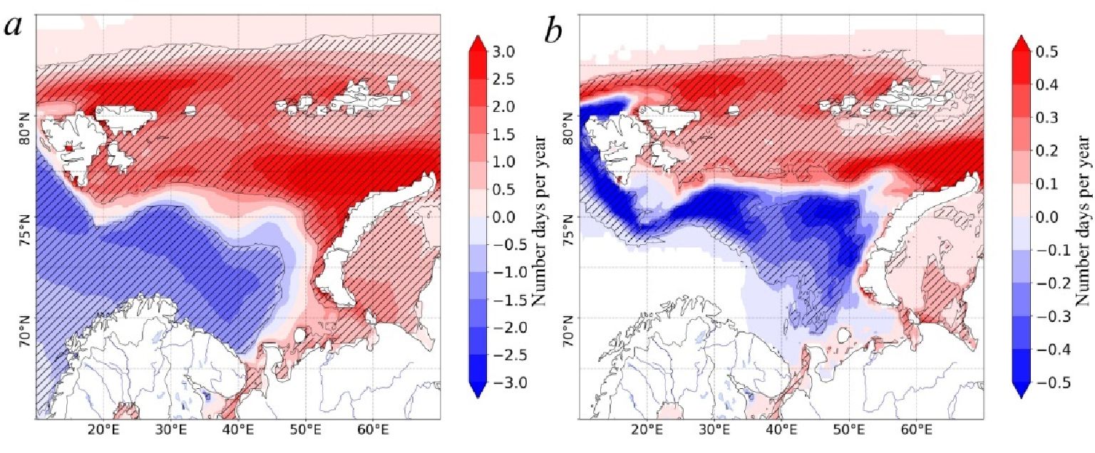 Fig. 3. Average annual number of days with vessel icing (a) and extreme icing (PPR > 83) (b) in the Barents Sea for the period of 1979–2022