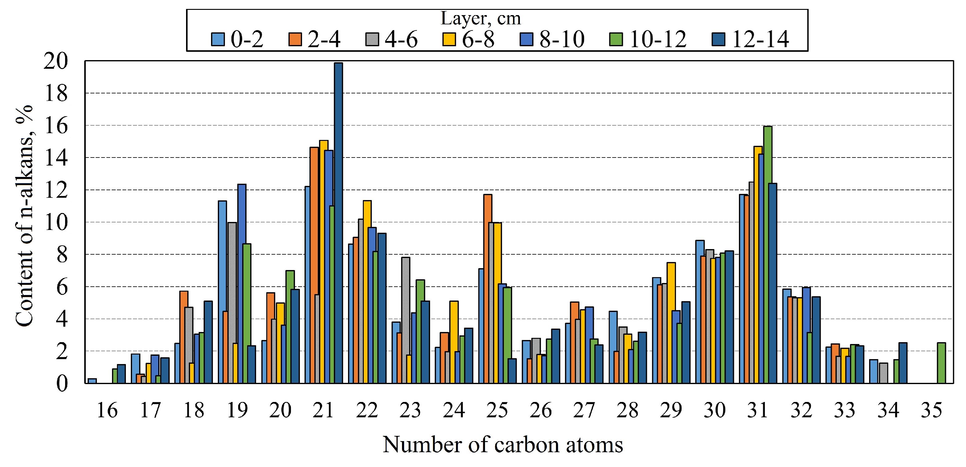 A relatively uniform distribution of the studied substances was observed across the horizons within the depth range of 0 to 10 cm, with the hydrocarbon content exhibiting fluctuations between 24.5 and 33.0 mg/kg (Fig. 7). In the deeper layers (10–12 and 12–14 cm), a decrease in the hydrocarbon concentration was observed, reaching 8.0–14.0 mg/kg. The concentration of n-alkanes in the columnar layers had a range of 2.5–11.4 mg/kg. The proportion of n-alkanes from hydrocarbons remained relatively consistent, with an average value of 31% and a range of 29 to 36%.