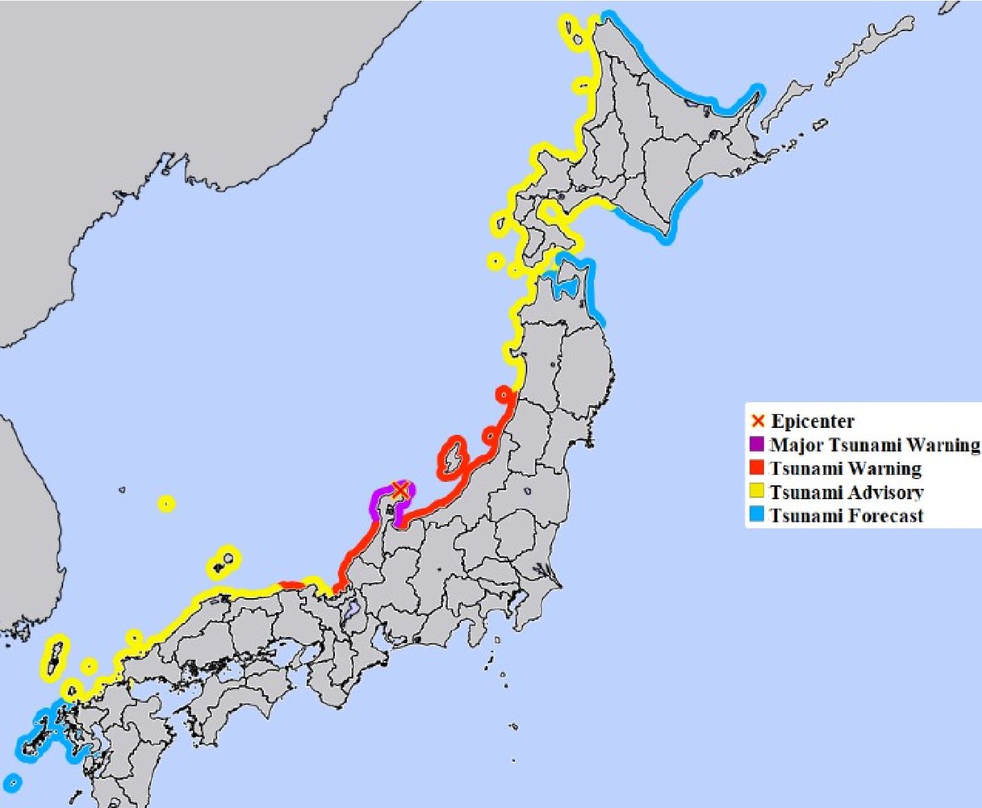 We consider a strong earthquake (M = 7.6) occurred on the Noto Peninsula in Ishikawa Prefecture, Japan, on 1 January 2024. As a result of a series of Earth tremors, massive destruction was caused in the towns of Suzu, Wajima, Noto and Anamizu. At the same time, significant damage was also recorded in the neighboring prefectures of Toyama and Niigata. As a result of this earthquake, a tsunami hazard was declared in several regions of Honshu Island. Japan Meteorological Agency issued a tsunami warning map, according to which, presumably, tsunami waves of 5 m in height approached the western coast of the island (Fig. 1).