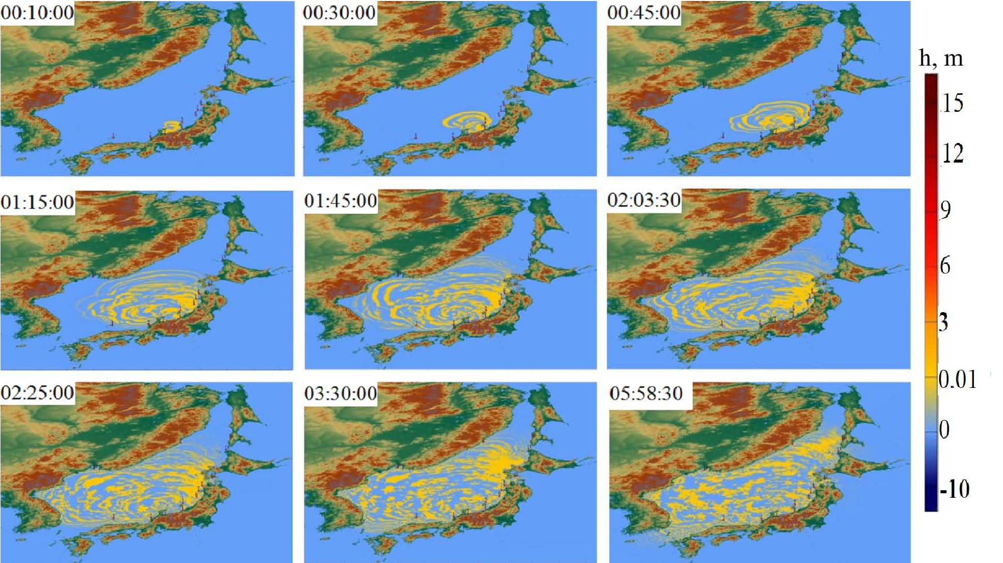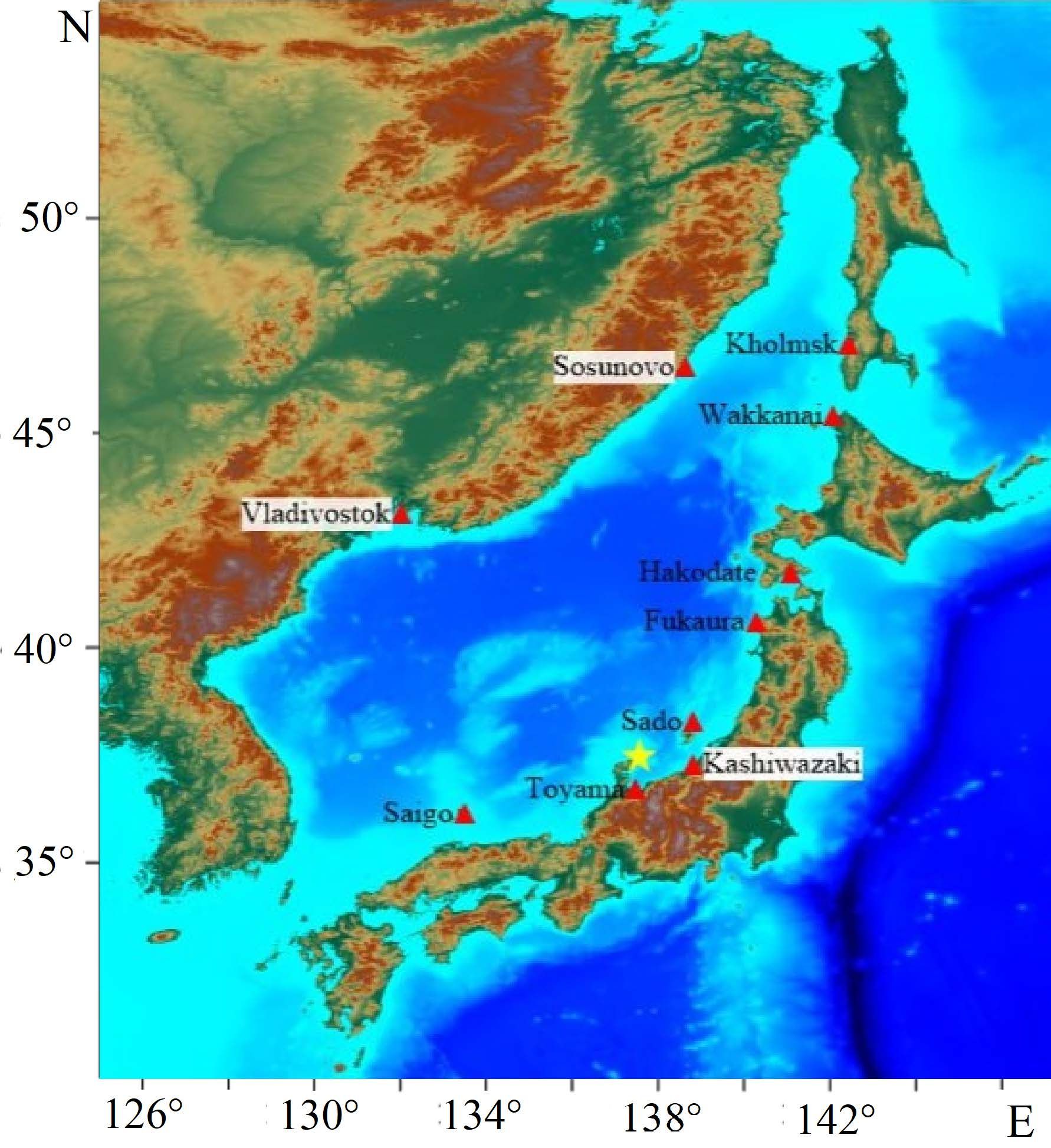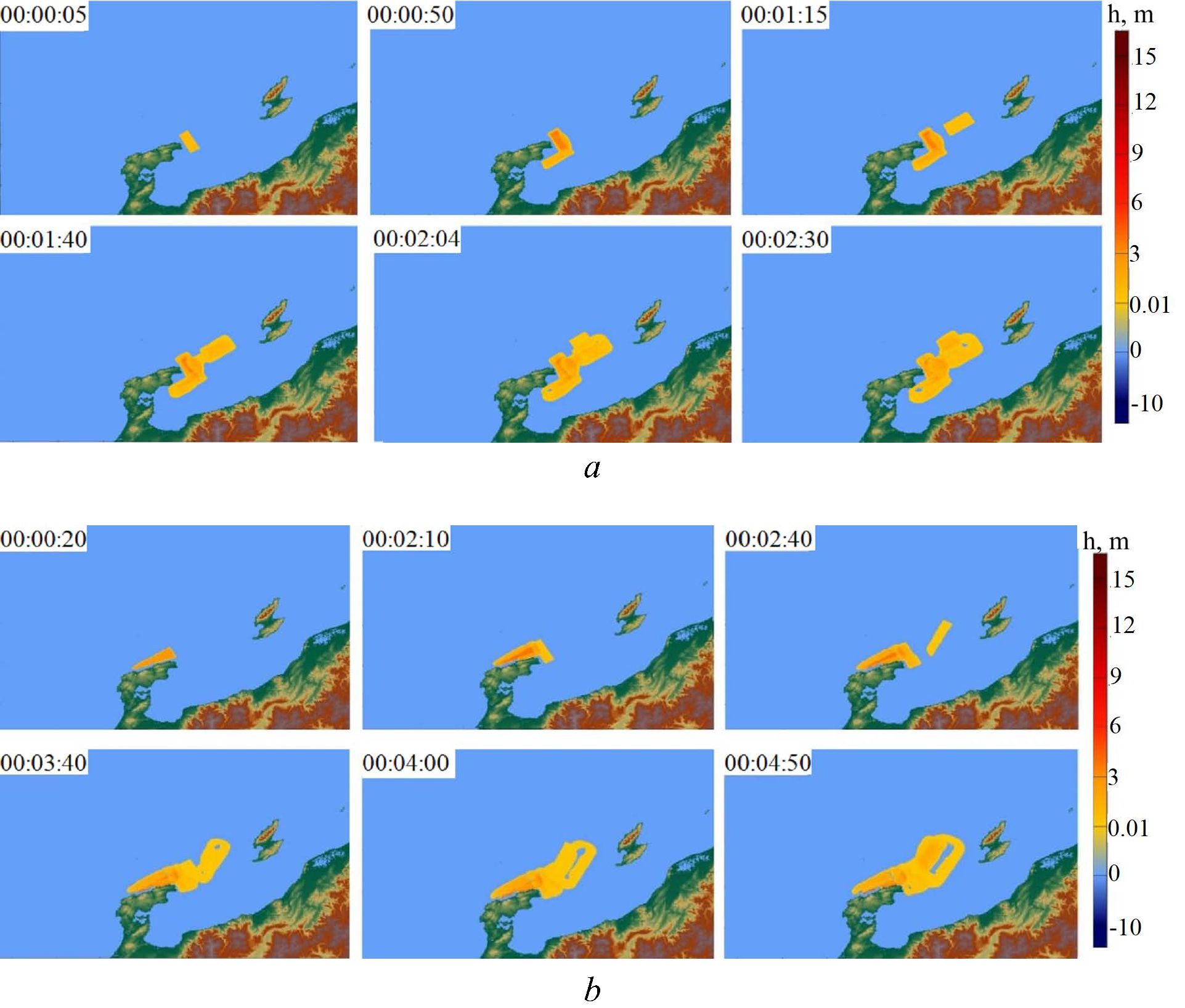 Fig. 6 shows the positions of wave fronts for nine points in time. It is clearly seen that 1-meter waves reach Sado Island 10 minutes after the start of generation, and the waves move in this direction faster than towards the bay; this is associated with the Toyama Trough. After 30 minutes, the wave front reached the coastal cities of Kashiwazaki and Toyama. At the 45th minute, the 0.5-meter wave front reached the northern part of Honshu Island and went around the Noto Peninsula. 1 hour 45 minutes after the earthquake, waves of ~20 cm height reached Vladivostok and the southern part of Hokkaido Island. At 05:56:30, the wave front reached Kholmsk, located in the northern part of Sakhalin Island.