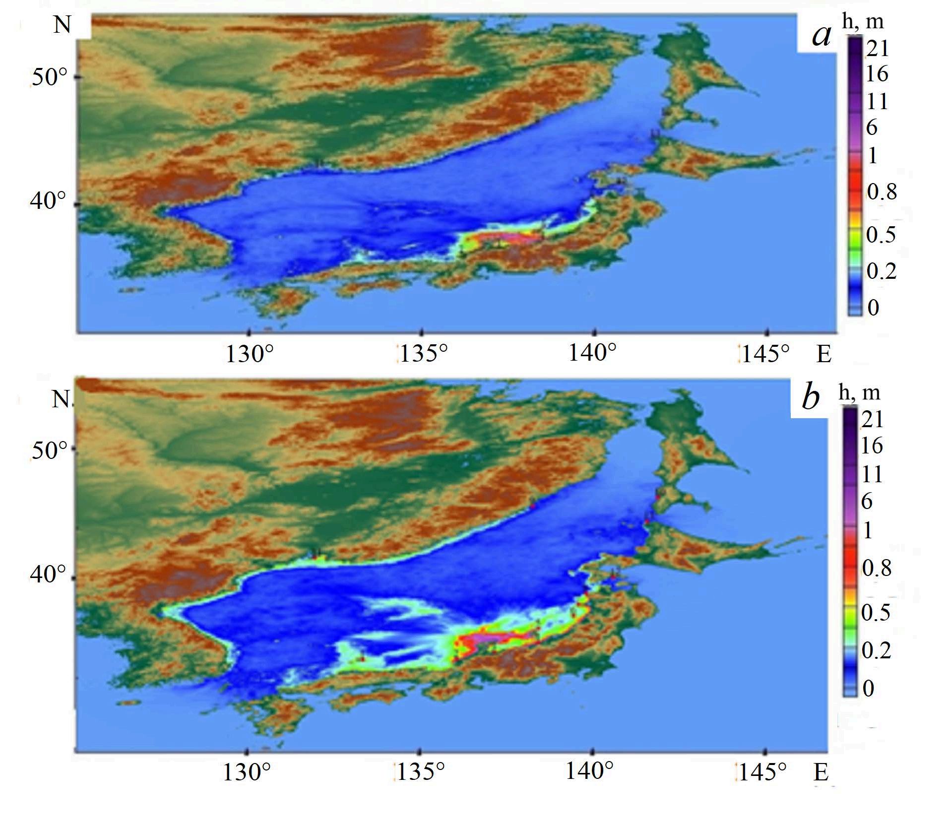 The distribution of heights in Fig. 7 shows good agreement with Fig. 1 where the most hazardous areas are the coasts located in the northeastern part of the Noto Peninsula as well as the cities of Toyama, Sado and Kashiwazaki. The computation is carried out up to the 5-meter isobath.