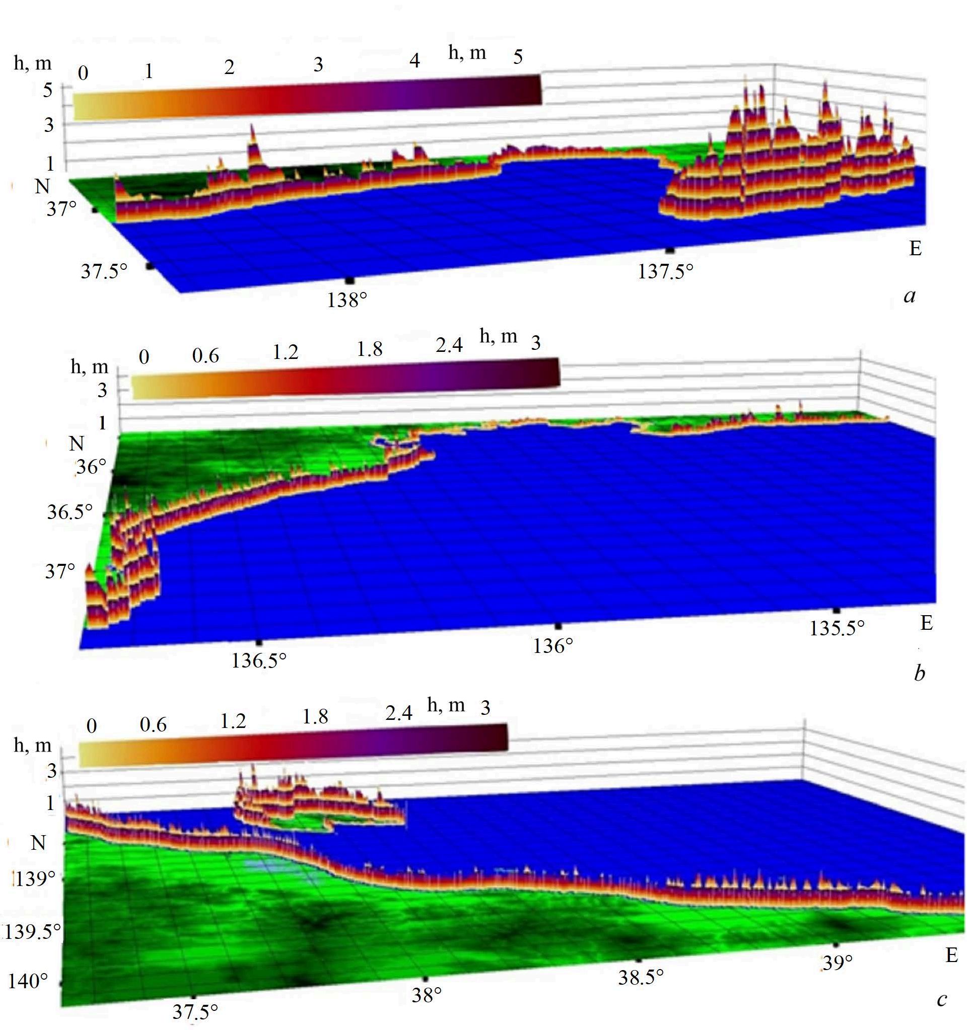 Fig. 8. 3D histograms of wave heights: a – Toyama Bay; b – Chuba and Kansai regions; c – Tohoku region and Sado Island (blue and green color correspond to sea and land respectively)