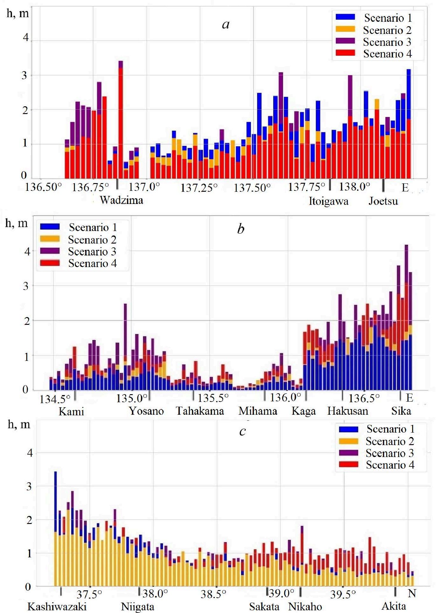Fig. 9, a demonstrates clearly that wave height is 3 m in scenarios 3 and 4 in the area of Wadzima town; the wave height in scenario 4 is less than a meter and it is 1–1.5 m in scenarios 1, 2 and 3 in Itoigawa and Joetsu. Fig. 9, c shows that the wave heights in scenario 1 on the coasts of the Chuba and Kansai regions are on average 0.5 m less than in scenarios 3 and 4. This is due to the fact that block 1 is located inside Toyama Bay in scenario 1 and in the opposite part of the Noto Peninsula in the other scenarios. Fig. 9, c illustrates that the wave height in scenario 1 is greater than in the other scenarios near Toyama Bay (up to 38°N) and northwards of the bay the wave heights of scenario 4 predominate. This is also due to the location of the blocks, since the greatest wave heights of scenario 1 propagate from Toyama Bay and the waves of scenarios 2, 3, 4 go around Sado Island and reach the northern part of Honshu Island with large amplitudes. Table 3 provides data for all performed scenarios (scenarios 1–4) and in situ data from tide-gauge stations 5.