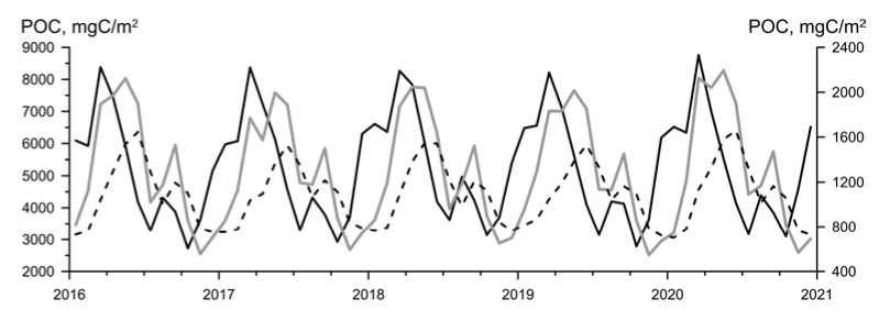 Fig.1. Temporal variability of total particulate organic carbon in three layers: 0–56 m (black line), 56–95 m (gray line), and 95–350 m (dashed line). The left ordinate axis refers to the 0–56 m layer, and the right one – to the other two layers. The graphs are constructed based on the results of numerical modeling