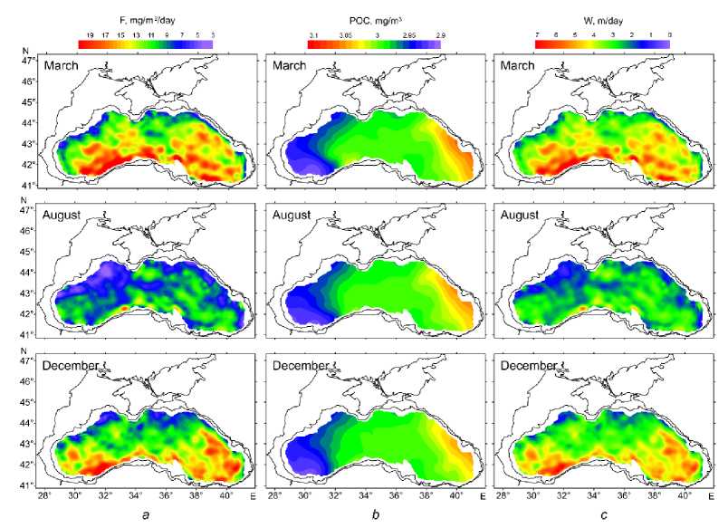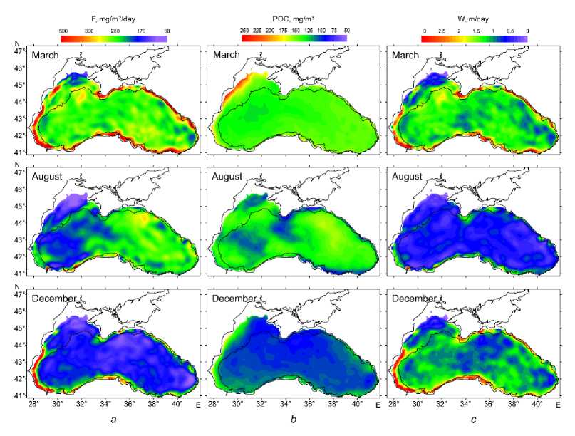 The monthly average maps of POC flux distribution, its concentration and vertical velocity at the 30 m horizon given in Fig. 3 were obtained by averaging over a 5-year period, with data from three months (March, August and December) being used to create the maps. In March, the POC concentration is elevated throughout the Black Sea (~ 150 mg/m3), and accordingly, the vertical POC fluxes also exhibit elevated values (~ 300 mg/m2/day) across the entire water area. In contrast, the POC concentration in August is notably lower than in March, and the vertical fluxes are also lower, particularly in the western part of the sea. The lowest values of POC concentration and vertical fluxes are observed in December. Therefore, at the 30-m horizon, the values of POC vertical fluxes correlate well with its concentration. This confirms the preceding conclusion that, within the near-surface layer of the Black Sea, vertical POC fluxes are predominantly determined by its concentration. In addition, the vertical velocity (Fig. 3, c) exhibits its lowest values in August, while the lowest fluxes are observed in December (Fig. 3, a). At the same time, the spatial variability of vertical velocity significantly affects the spatial distribution of fluxes. For instance, in March, elevated values of vertical velocity are observed along the basin periphery, which coincide with the increased POC flux values in these locations. Furthermore, in December, elevated vertical velocities and increased values of POC fluxes are observed along the deep-water section of the western coast and the southern coast of the Black Sea.
