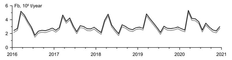 Based on the obtained fields it is possible to estimate an amount of particulate carbon that settles to the bottom and is thereby removed from the Black Sea carbonate system. Given that the liquid vertical velocity at the seabed is zero due to the impermeability condition, the vertical flux of particulate carbon at each point on the seabed will be equal to , where is concentration of particulate carbon in the bottom cell. Fig. 8 illustrates the total flux of particulate carbon towards the Black Sea bottom for the entire water area and the shelf zone. The flux values for the shelf and the entire sea are almost identical. This observation indicates that the sedimentation of particulate carbon to the bottom mainly occurs on the shelf due to the fact that in a significant part of the NWS the depth is less than 50 m. At these depths, the concentration of POC exceeds the corresponding values in the deeper layers of the sea by two orders of magnitude. The maximum settling to the bottom occurs approximately in March, which corresponds to the maximum total POC content in the photosynthetic layer (Fig. 1).