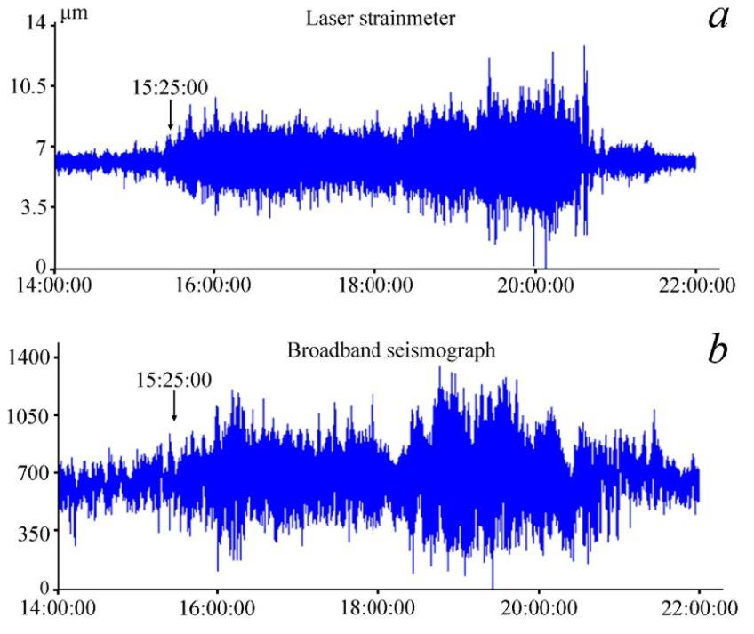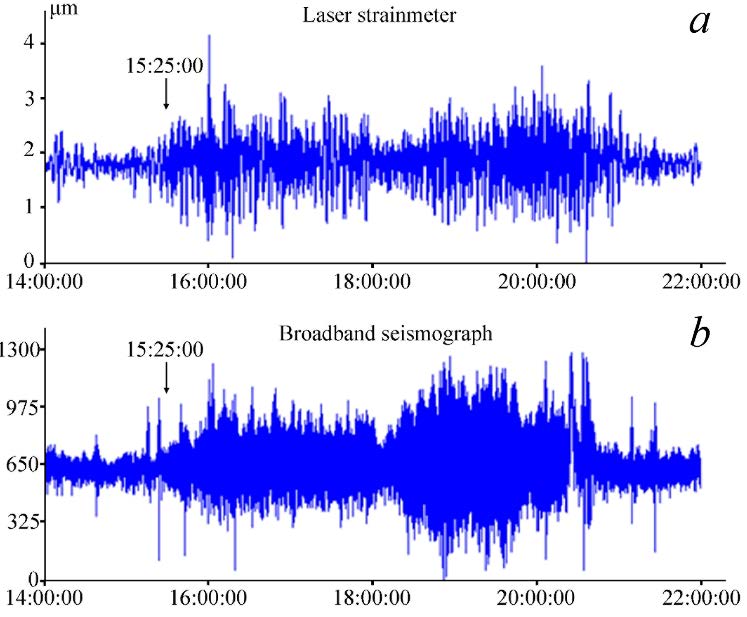 Fig. 6. Filtered fragment of the recording of the laser strainmeter of North-South orientation (a) and fragment of the broadband seismograph recording (b) for May 25, 2015, UTC (adapted from [22])