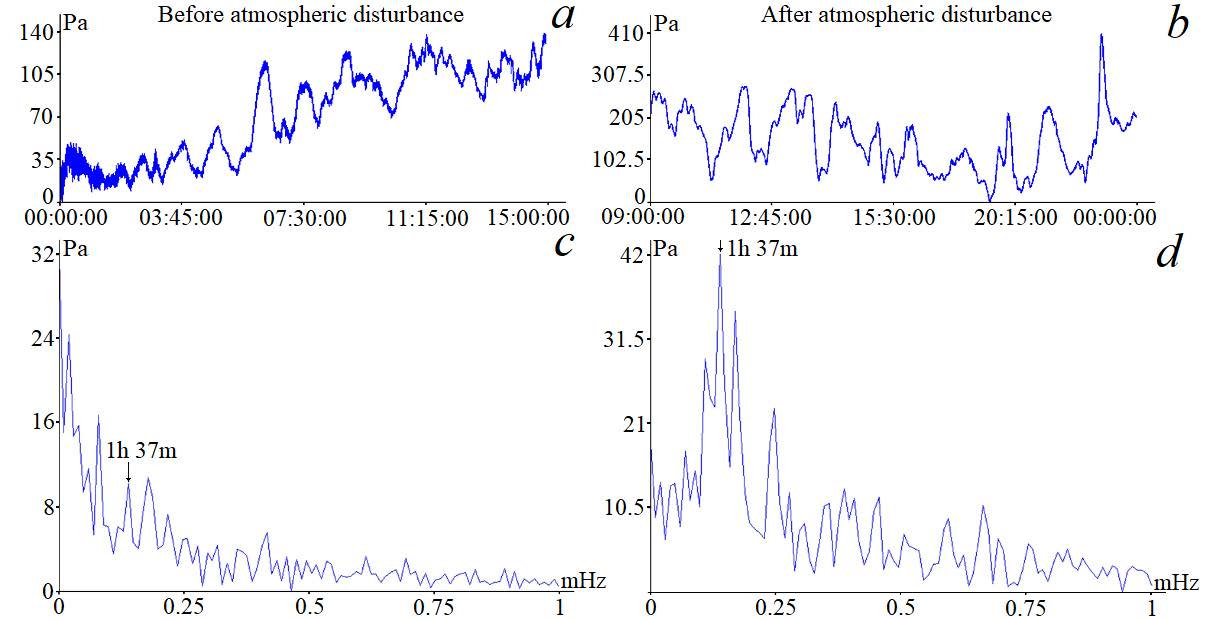Conclusions. As a result of a comprehensive analysis, a sharp increase in atmospheric pressure was recorded, which led to the appearance of waves in the hydrosphere, exceeding the amplitudes of the daily tide in the studied region, an increase in the amplitude of microdeformations of the Earth’s crust with periods from 2 to 2.5 min was detected. A sharp change in atmospheric pressure caused an increase in the amplitudes of infragravity wave oscillations. A few hours after the passage of the last wave, the registration of vibrations and waves with a period of 1 hour 37 minutes in all geospheres began simultaneously on all records of laser interference devices. The analysis of the data obtained with the laser interference devices showed that the main source of these vibrations was in the atmosphere.