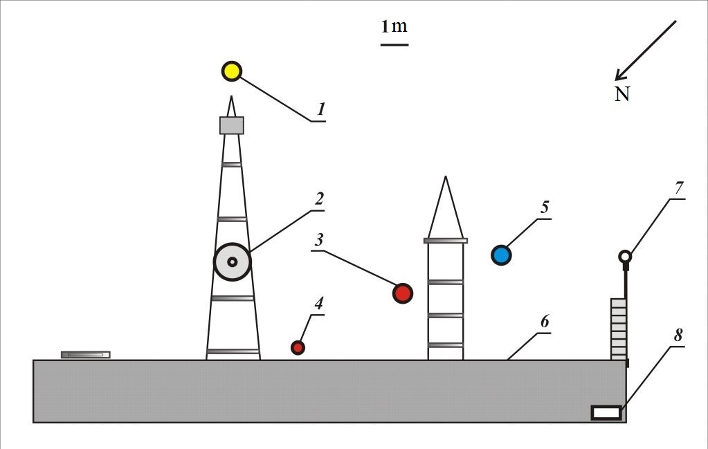 Fig. 1. Layout of the basic measuring systems at the oceanographic platform during the experiments in May – June, 2021: 1 – DVS-6000 acoustic Doppler profiler; 2 – Sigma-1 measuring system; 3 –Vostok-M current velocity meter; 4 – MHI-1308 current meters (4 pcs.); 5 – Workhorse Monitor acoustic Doppler profiler; 6 – oceanographic platform; 7 – string wave recorder; 8 – meteorological system