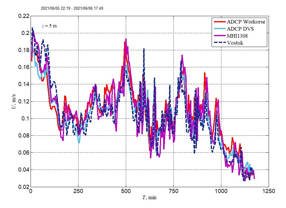 Fig. 2. Mean current velocity module based on measurements by various instruments at the 5 m depth in the area of the oceanographic platform on June 5–6, 2021. The data are reduced to a resolution of 5 min
