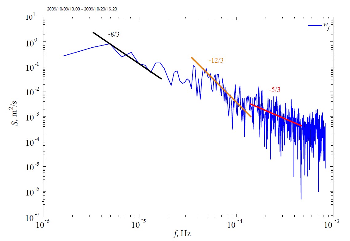 As illustrated in the above figure, the spectrum exhibits a complex shape with various slopes across different ranges. Studies of atmospheric turbulence [13, 15] have demonstrated that coherent turbulence differs from Kolmogorov turbulence by a faster decrease in the spectrum (sections with −8/3 and −12/3 slope), i.e., the presence of such sections in our data indicates the existence of coherent structures.