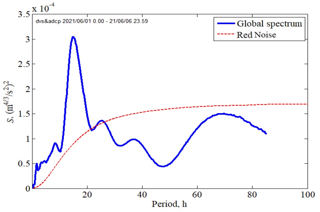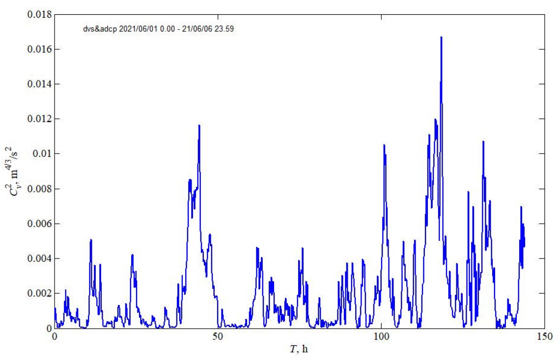 The principal data array selected for the analysis of synchronous measurements of horizontal current velocity at spaced points and the calculation of structural functions was obtained during the active operational period (01 June 2021 – 06 June 2021) by the DVS-6000 and WorkНorse Monitor complexes (3 and 8 in Fig. 1). A fragment of the records is presented above in Fig. 2. The structural functions were calculated using relations (1) and (2), with the time shift varying from 5 min to 1 h in the latter case. The variability of the longitudinal structural parameter for the specified period is shown in Fig. 4, and the global spectrum calculated using wavelet analysis is shown in Fig. 5.