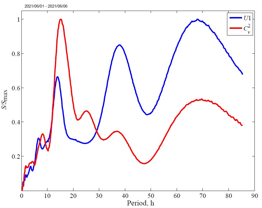 Figure 5 shows a clearly expressed maximum in the spectrum at a period of ~ 15 h. This indicates that such structures predominate over a time span of several days. However, when examining shorter intervals, particularly intra-day fluctuations in the intensity of velocity fluctuations, scales with the 1.5- and 3.5-hour periods are clearly visible. It is noteworthy that maxima exceeding the “red noise” level are considered significant in the global spectrum. The current velocity spectrum differs from the spectrum of the structural parameter. As illustrated in Fig. 6, which shows the global spectrum normalized to its maximum value and the current velocity spectrum calculated from the velocity modulus values, the contribution of currents to turbulence on larger time scales (peaks at ~ 40 and ~ 70 h) is significantly lower than on the 15-hour scale. This is evident from the spectral function level.
