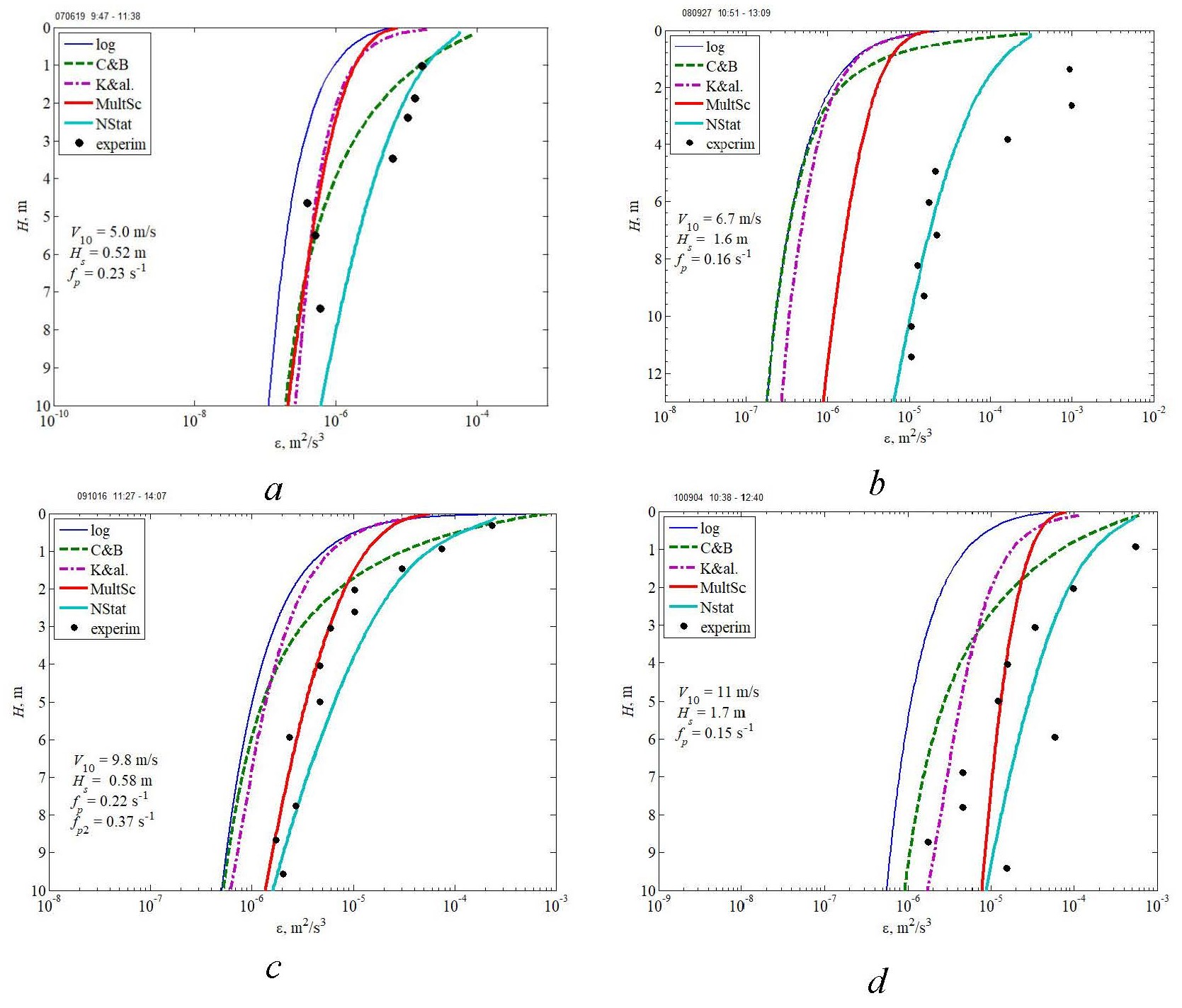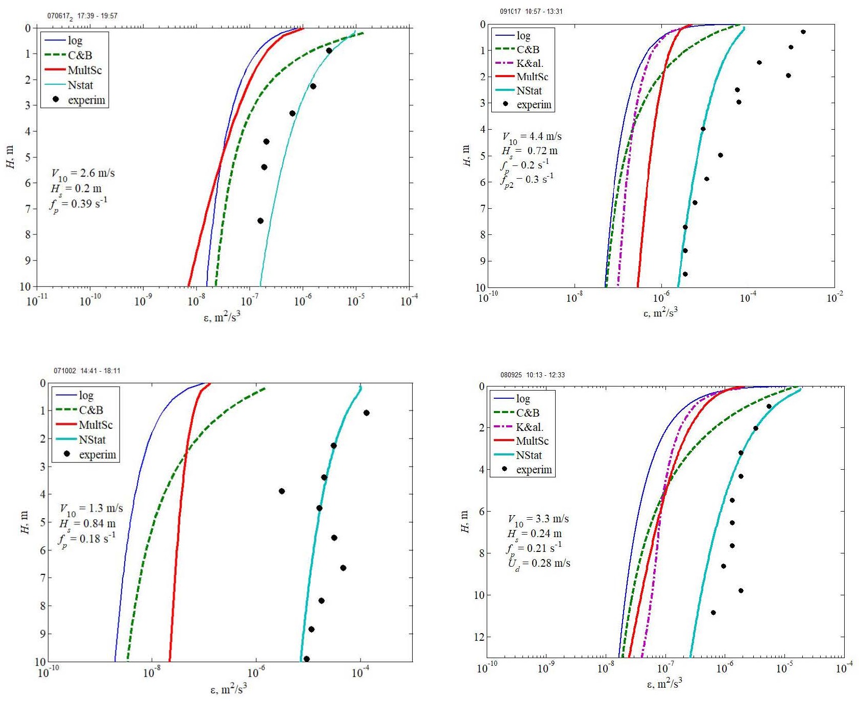 The MHI Turbulence Department staff has been conducting experimental observations on the oceanographic platform for a number of years, thus accumulating extensive arrays of data on the turbulent regime of the near-surface layer under various hydrometeorological conditions. The data, which include measurements of the vertical distribution of the turbulent energy dissipation rate, provide a valuable opportunity to verify various models across a range of wind speeds and wave types. As previously mentioned, a notable shortcoming in the modeling of vertical turbulent exchange in the near-surface layer is the discrepancy between calculated and measured values of the dissipation rate at weak winds. A comparison of calculations using the improved model and natural data demonstrated that this issue is largely solved by the proposed method of incorporating additional turbulization of the layer using the structural function.