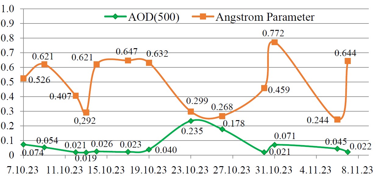 In the period from 07.10.2023 to 07.11.2023, abnormally low values of the Angstrom parameter and AOD were obtained (Fig. 8). Out of 13 days of measurements, only on one day (23.10.2023) the values of the aerosol optical depth (AOD(500) = 0.26) exceeded the background values, however, the values of the Angstrom parameter (α = 0.3) for this day were also much lower than the background value (α = 1.25). Sunny clear weather was observed on 23.10.2023 until 14:00. During this period of the day, the values of the main optical properties were different from the background values. This corresponds to the presence of aerosol in the atmosphere, such as dust aerosol or smoke. At the same time, according to the Espada M3 detector, the concentration values of PM2.5 particles did not exceed 12 μg/m3 and PM10 – 13 μg/m3.