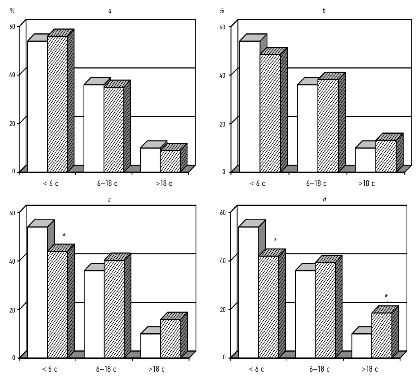 Рис. 2. Изменение соотношения периодов разной длительности (в %) в ритмической структуре плавания крыс под влиянием различных анксиолитиков. Светлые столбики означают исходные данные, заштрихованные — результаты применения физологического раствора (a), диазепама (b), тофизопама (c) и мелатонина (d), *p < 0,05 к исходным данным