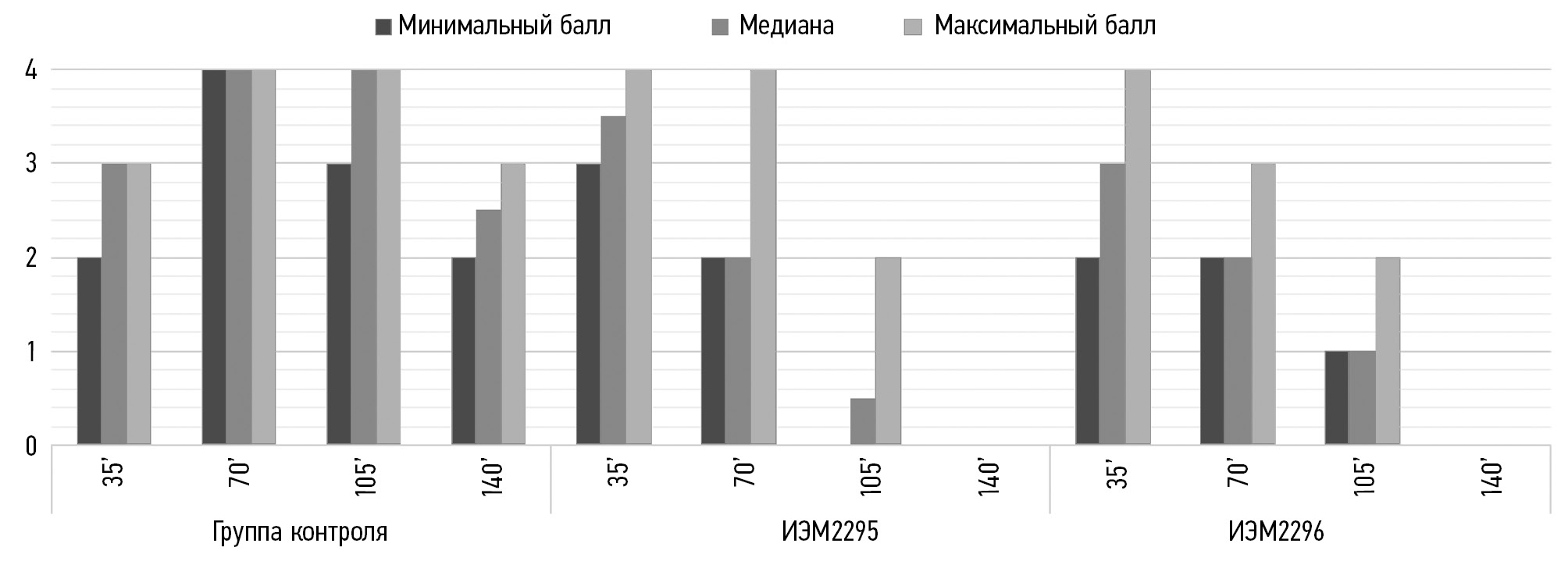 When assessing limb dyskinesia (Fig. 1), statistically significant differences were revealed between the control group and the IEM2295 group at the 70th (p = 0.028846), 105th (p = 0.000203), and 140th (p = 0.000195) minute and between the control group and the IEM2296 group at the 70th (p = 0.039564), 105th (p = 0.000208), and 140th (p = 0.000173) minute.