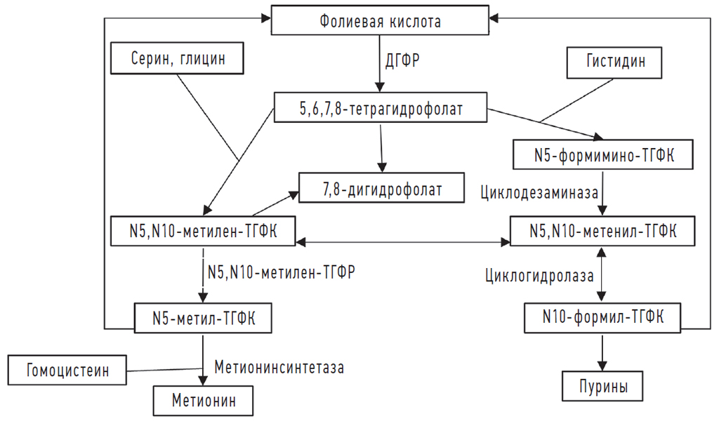 Фолиевая кислота является эссенциальным биологически активным веществом в живом организме, она обеспечивает процесс репликации ДНК и синтез нуклеотидов. Поскольку она жизненно необходима, в процессах обмена веществ ее используют не только многоклеточные организмы, но и микроорганизмы. Одним из главных путей ее метаболизма является метиониновый и гомоцистеиновый обмены: образуется метилирующий агент — S-аденозинметионин (SAM), который участвует в процессе метилирования белков, медиаторов, нуклеотидов, фосфолипидов и гормонов [1]. На рисунке 1 изображен полиморфизм превращений фолиевой кислоты в макроорганизмах [2]. N5,N10-метилететрагидрофолат (МТГФ) и N10-формилтетрагидрофолат напрямую участвуют в биосинтезе нуклеотидов de novo, в частности, недостаток данных форм фолиевой кислоты может привести к тяжелым дефектам нервной трубки в результате встраивания в ДНК урацила вместо тимина.