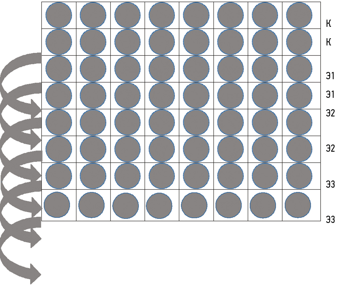Исследование проводили на рыбках Danio rerio природного окраса (n = 24). Рыбок содержали в просторных аквариумах при температуре воды при +21 °С раздельно самок (n = 12) и самцов (n = 12) в течение 2 сут при стандартных компонентах грунта, стандартной аэрации и рН воды. Световой цикл составлял 9/15 ч. Кормили взрослых особей 1 р/сут в 14:00, содержали на стандартном рационе. Далее через 2 сут самцов и самок в соотношении 4:3 пересаживали в один аквариум с водой температуры +23 °С, на дне аквариума была расположена стандартная сетка для нереста. Рацион кормления оставался стандартным. Через 1 сут в утренние часы самки начинали нерест. Через 3–4 ч после начала нереста рыбок аккуратно вылавливали из аквариума, сетку осторожно промывали в этом же резервуаре и со дна индивидуально микропипеткой собирали каждую икринку. Для оценки эффективности нуклеоспермата натрия в отношении выживаемости эмбрионов данного вида собранную икру в количестве 64 штук разместили в отдельных лунках, исходя из следующей схемы (рис. 1). Использовали 3 дозы нуклеоспермата натрия: Э1 — доза I нуклеоспермата натрия (50 мкг/200 мкл на лунку), Э2 — доза II (1,3 мкг/200 мкл), Э3 — доза III (0,0325 мкг/200 мкл). Эксперимент проводили в течение 8 сут и оценивали следующие параметры: кровообращение, выход личинки из икринки, движение эбриона внутри икринки, движение появившейся личинки. Полученные результаты обрабатывали статистически с использованием критерия χ2 при р < 0,05.