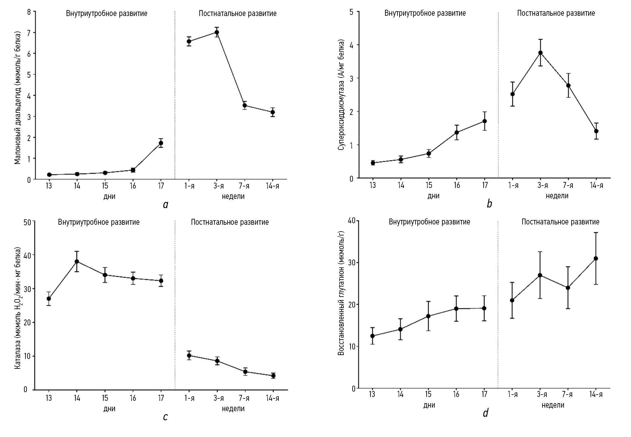 Материалы и методы. Были отобраны 39 беременных самок крыс Вистар массой 220–250 г, от которых получено 176 эмбрионов и крысят разного пола и возраста, включая эмбрионы 3-го триместра беременности (13–17-й дни гестации) и крысят в возрасте от 1 до 14 нед. В ткани головного мозга определяли концентрацию малонового диальдегида (показатель перекисного окисления липидов), а также активность супероксиддисмутазы, каталазы и уровень восстановленного глутатиона в качестве показателей систем антиоксидантной защиты.