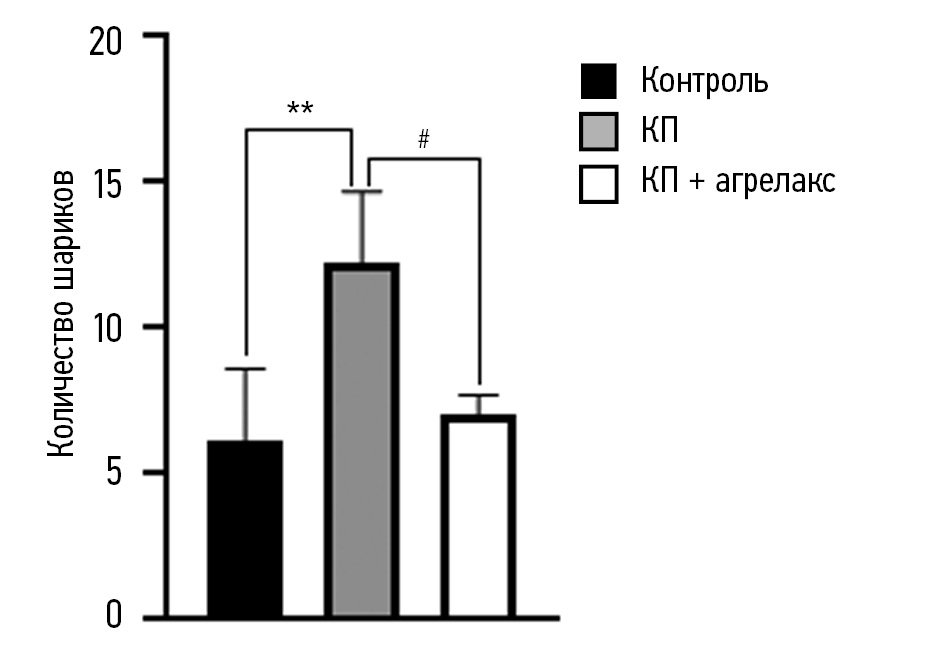In this study of compulsive behavior using the marble burying test, the experimental group of animals that received additional high-calorie food buried a significantly greater number of marbles (p < 0.01) compared to the control group. This indicates increased compulsive behavior and confirms the development of compulsive overeating. After a 7-day course of Agrelax administration, the number of buried marbles significantly decreased, reaching the control group values (p < 0.05), which indicates an improvement in the compulsive behavior manifestations (Fig. 1).