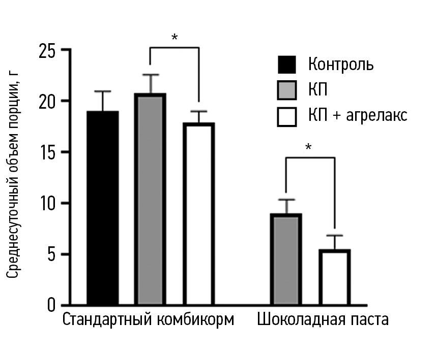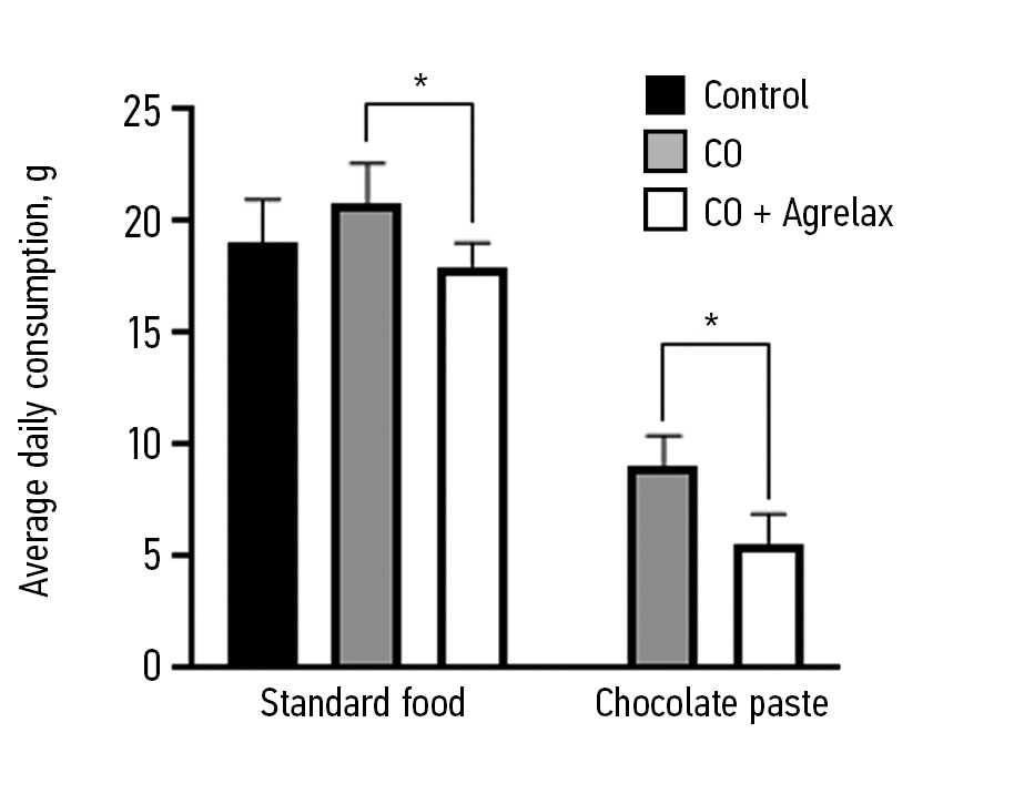 Fig. 2. Effects of agrelax on the consumption of standard pelleted and high-calorie food in the compulsive overeating rat model (CO). *p < 0,05