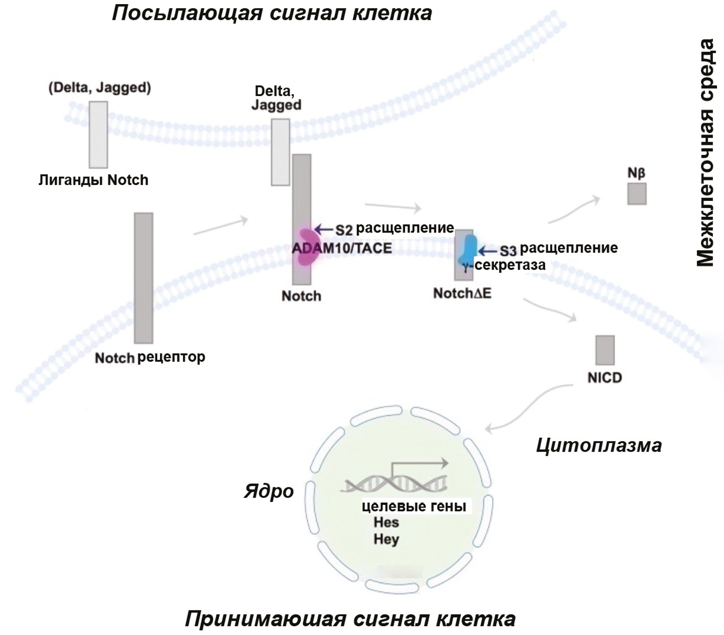 Рис. 5. Активация рецептора Notch (c изменениями по [80]). Лиганды Notch (Delta, Jagged) из клеток, передающих сигнал, связываются с рецепторами Notch (Notch 1–4) в клетках, принимающих сигнал. Notch подвергается высвобождению эктодомена металлопротеазами ADAM (ADAM10, TACE) на внеклеточном участке S2 (расщепление в позиции S2). Связанный с мембраной отсеченный фрагмент NotchΔE в качестве субстрата γ-секретазы дополнительно расщепляется протеазой в позиции S3 (расщепление S3), при этом высвобождаются фрагмент Nβ и внутриклеточный фрагмент NICD, который транслоцируется в ядро и регулирует транскрипцию целевых генов Hes и Hey