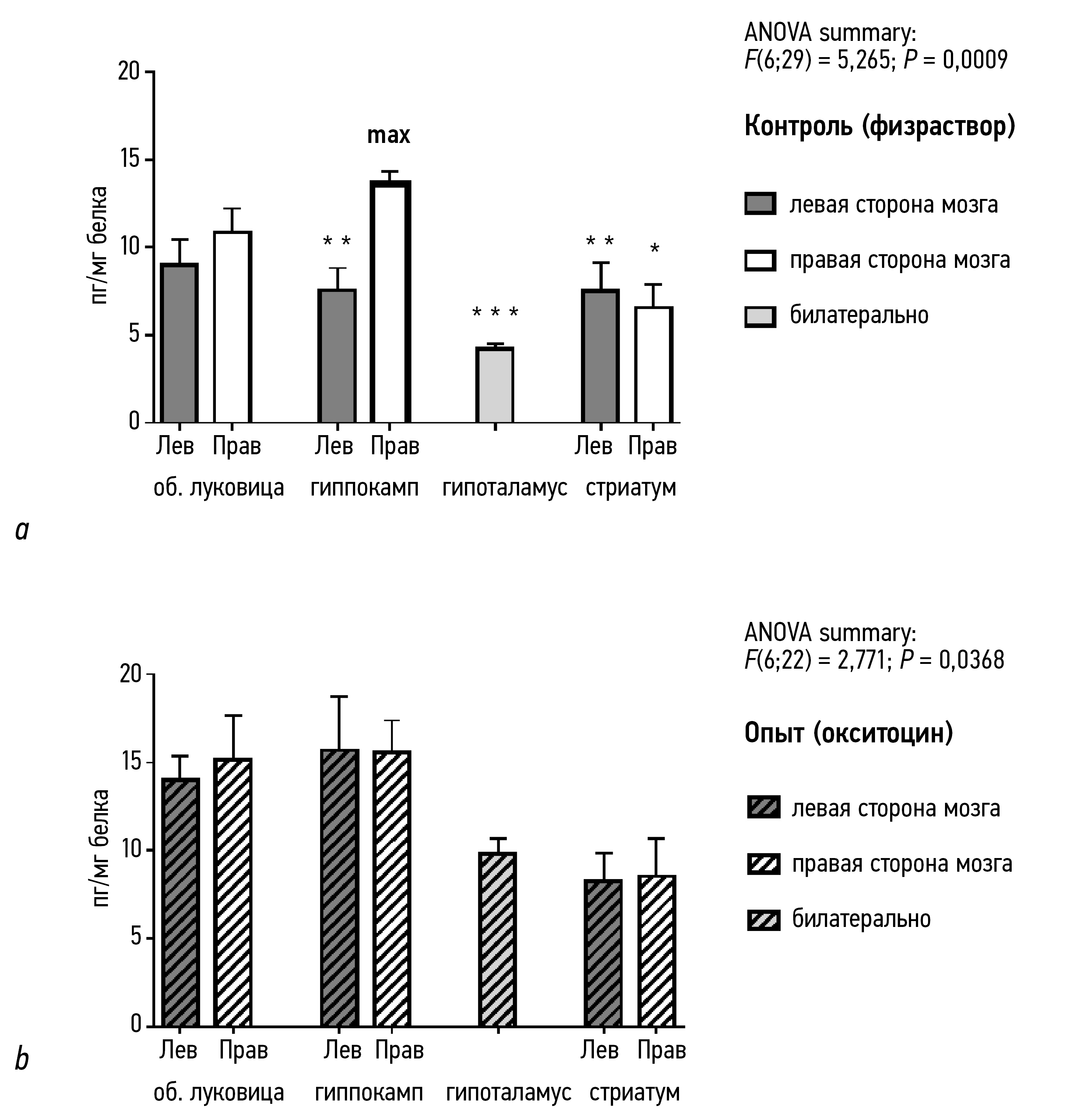 Рис. 1. Уровень окситоцина в головном мозге мышей (пг/мг белка): а — после введения физиологического раствора, b после введения окситоцина. Примечания: Лев левая сторона мозга, Прав правая сторона мозга; в нижней строке — области мозга, где измеряли уровень окситоцина: об. луковица — обонятельная луковица. На фрагменте а жирной линией и надписью «max» выделен столбик, показывающий содержание окситоцина в правом гиппокампе. Высота столбиков соответствует среднему значению, длина вертикального штриха — ошибке среднего (M ± SEM). Отмечены значимые отличия от содержания окситоцина в правом гиппокампе: * — р < 0,05; ** р < 0,01; *** р < 0,001 (по результатам ANOVA)
