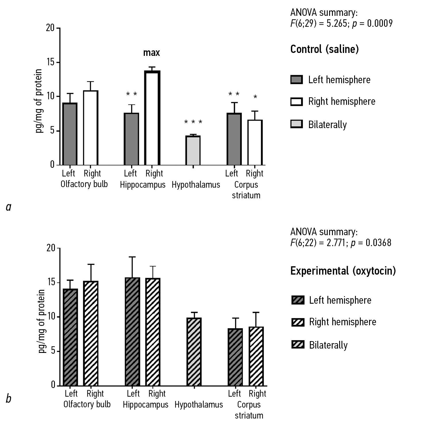 2. Fig. 1. Oxytocin levels in the mouse brain (pg/mg of protein): a , after saline administration; b , after oxytocin administration. Notes: “Left”, left side of the brain; “Right”, right side of the brain. Brain areas assessed: olfactory bulb, hippocampus, hypothalamus, and striatum. In fragment a , the bar representing oxytocin concentration in the right hippocampus is highlighted with a bold line and labeled “max”. Bar heights represent mean values, with error bars indicating standard error (M ± SEM). Significant differences from oxytocin levels in the right hippocampus: * — р < 0.05; ** — р < 0.01; *** — р < 0.001 (based on ANOVA)